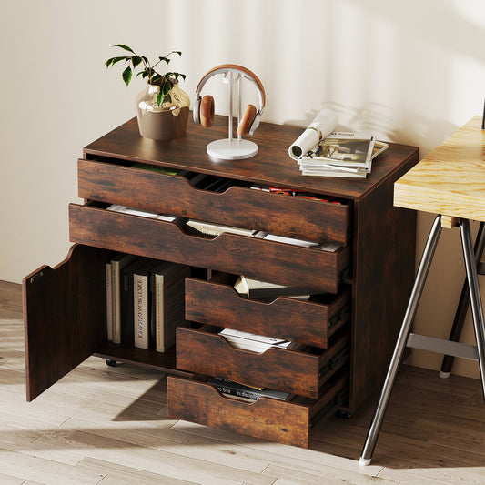 5 Drawer Mobile Lateral Filing Storage Home Office Floor Cabinet with Wheels-Rustic Brown