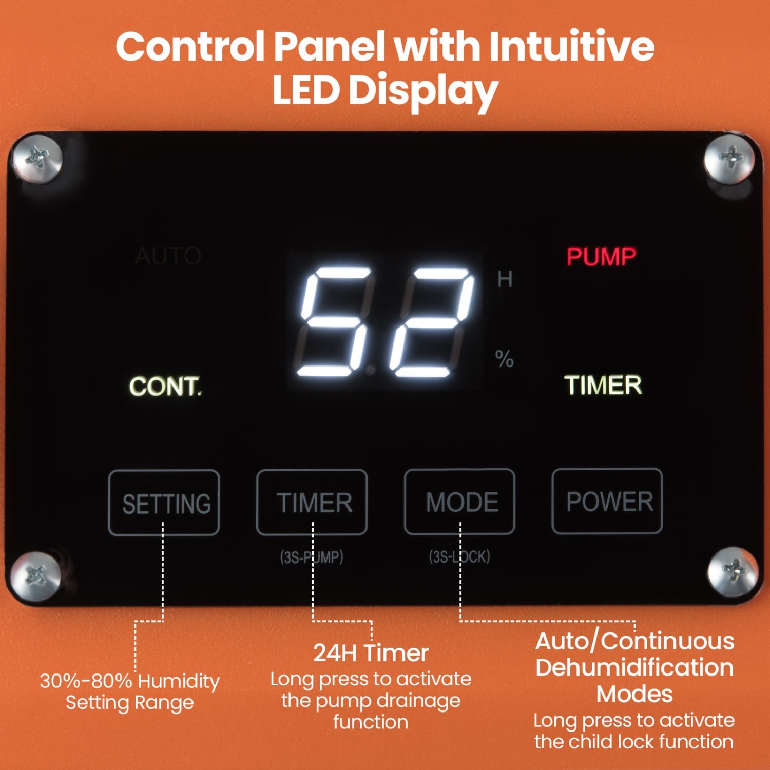 Commercial-Grade Dehumidifier: With 140 pints per day dehumidification capacity (at 95„‰ 90% RH) this dehumidifier quickly tackles excessive humidity in large areas up to 1800 sq.ft. It is perfect for basements job sites warehouses workshops and commercial environments that demand reliable powerful performance. Customizable Humidity Control: This dehumidifier lets you set your preferred humidity between 30% and 80% for optimal air quality. Plus you can choose between auto and continuous dehumidification modes to match your needs ensuring the perfect balance of air comfort and energy efficiency every time. Versatile Drainage Options: Pump and gravity drainage methods ensure hassle-free operation. You are able to easily direct water where you need it using the included 16.5 ft drain hose while built-in overflow protection gives you peace of mind during extended use. User-Friendly Features: The intuitive control panel with a digital display allows for easy adjustments. This dehumidifier includes auto defrost for continuous operation child lock and a 24-hour timer. The removable and washable filter helps keep air fresh and maintenance simple. Easy Portability and Storage: This industrial dehumidifier is equipped with a sturdy folding push-and-pull handle 2 recessed handles and 2 smooth-rolling wheels for effortless movement and transport. The dedicated storage compartment keeps your drain hose and power cord neatly organized.