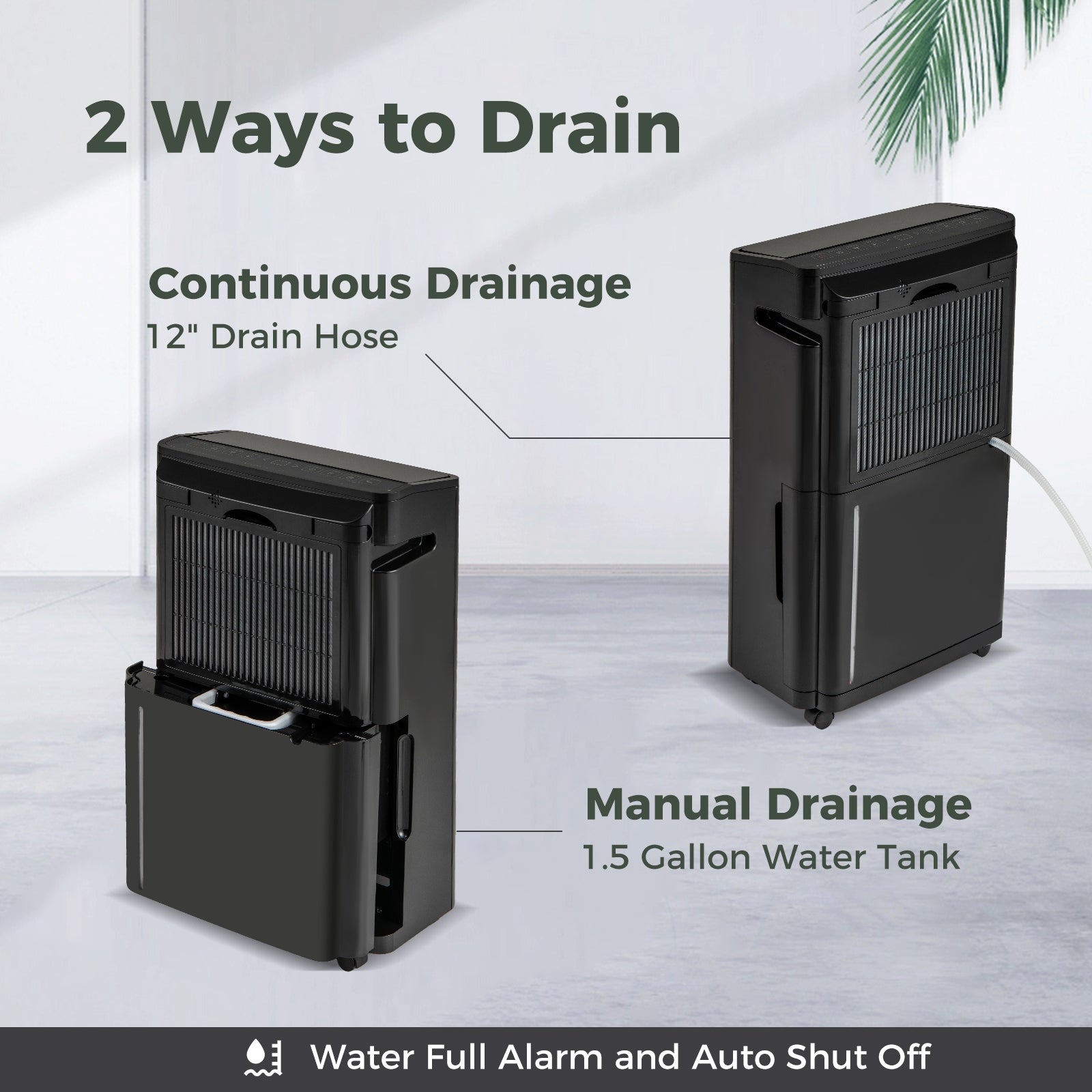 â— Double Drainage Methods: This dehumidifier offers 2 ways to drain: manually remove water with the easily detachable 1.5 gallon water tank or opt for continuous drainage by attaching the provided 12" drain hose. Enhanced with overflow protection the dehumidifier automatically shuts off when the tank is full.