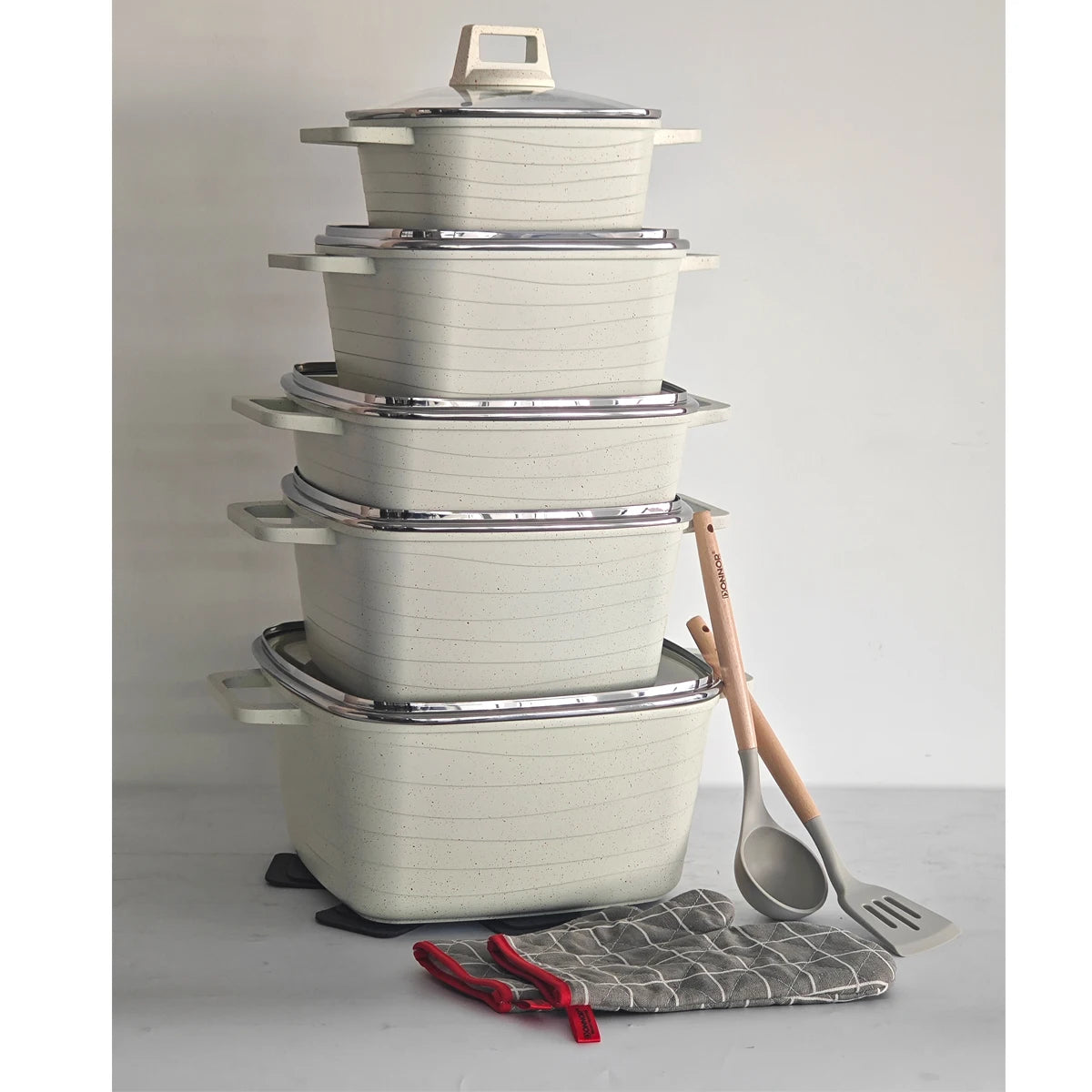 The DONNOR Square Eco-Friendly Granite Non-Stick Cookware Set is a perfect addition to any modern kitchen. This set is designed for general use on gas and induction cookers, ensuring versatility for any stovetop. Made with die-cast aluminum and coated with a granite non-stick finish, it ensures easy cooking and cleaning without the need for excess oil.