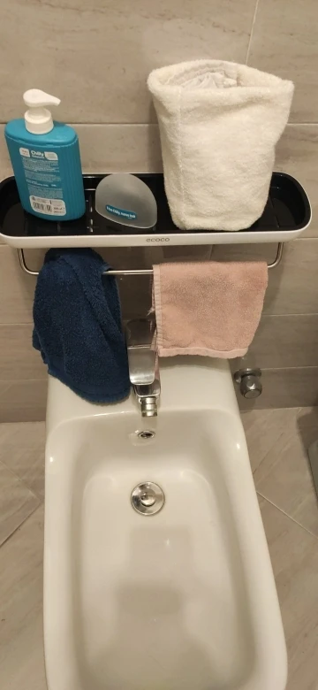 - Design: Single-tier shelf with towel bar and drain holes