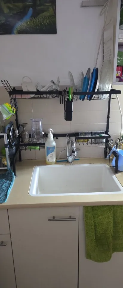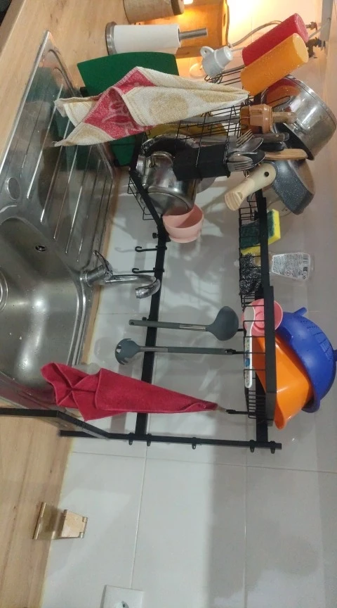 Upgrade your kitchen with this large over-the-sink dish drying rack designed to maximize vertical storage without taking up valuable counter space. Made from rust-proof steel iron, it features an adjustable length range of 26"–33.5" and adjustable height from 21.7"–23.2", ensuring a perfect fit for most sinks. The retractable frame accommodates both single and double sinks, while multiple hanging baskets and accessories create customizable storage for plates, bowls, utensils, cutting boards, and cleaning tools. Water drips directly into the sink for efficient drainage, and assembly is quick with included tools. A durable multifunctional organizer that keeps your kitchen clean and clutter-free.